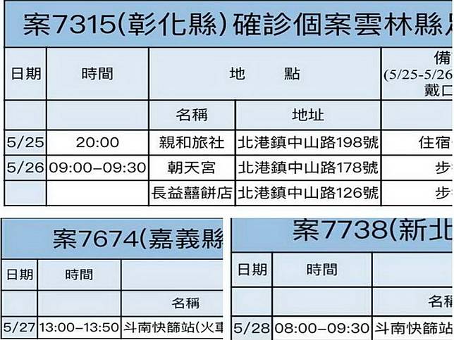 © 由 nownews 提供 ▲中央流行疫情指揮中心針對疫情做出最新說明。 (示意圖/翻攝自 pixabay). 基隆市 臺北市 新北市 桃園市 新竹市 新竹縣 苗栗縣 臺中市 彰化縣 南投縣 雲林縣 嘉義市 嘉義縣 臺南市 高雄市 屏東縣 臺東縣 花蓮縣 宜蘭縣 澎湖縣 金門縣. 環保通報 抗旱專區 法律諮詢 縣長行程 防疫補償 商業登記 無萊豬 彰化sbir 工商憑證 好康報報 防疫措施 確診足跡公告 疫情紓困方案. 嘉義縣的套房式飯店 嘉義縣的附陽台的飯店 嘉義縣的獨家景點 嘉義縣的spa景點 嘉義縣的spa飯店 嘉義縣有飯店巴士接送 嘉義縣的家庭旅遊景點. 嘉義縣太保市祥和一路東段一號 (7,811.32 mi) chiayintsun, taichung, taiwan, 61351.